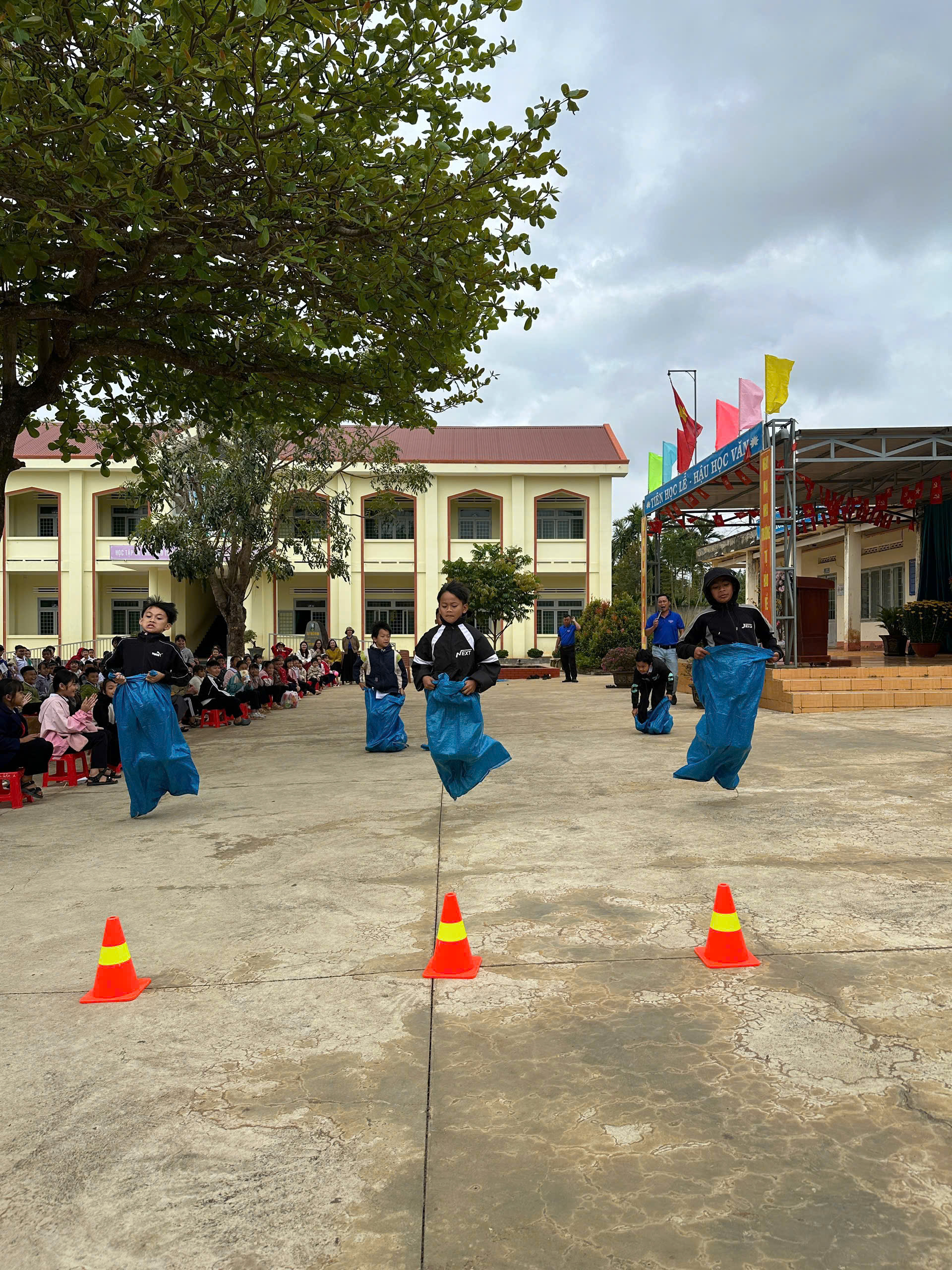 Bên cạnh đó, các em còn được tham gia nhiều trò chơi dân gian sôi nổi, hấp dẫn như: nhảy bao bố, ném bóng vào sọt,… thu hút sự hưởng ứng nhiệt tình, tạo không khí vui tươi, đoàn kết trong toàn trường.
